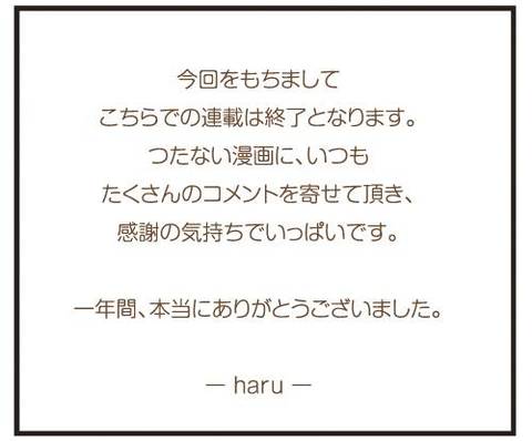 こちらも終了なんですね。寂しいわ・・・。ひそかにまめちゃんのファンだったんですけど。 やわらかい絵も好きです。一年間楽しませていただき、ありがとうございました。